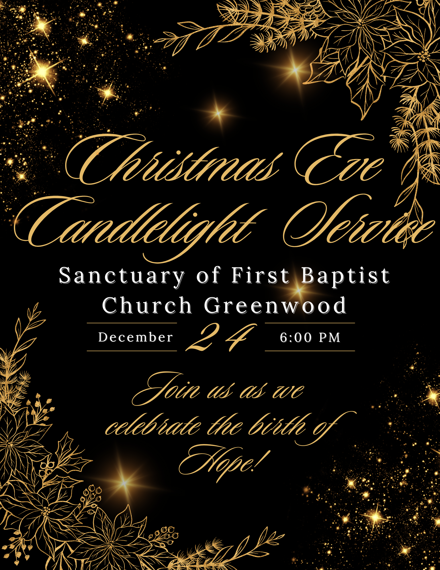 Join us in the Sanctuary of First Baptist Church Greenwood for a beautiful Christmas Eve Candlelight Service on December 24 at 6:00 p.m. Come celebrate the birth of Hope with an evening of worship, Scripture, and candlelight.