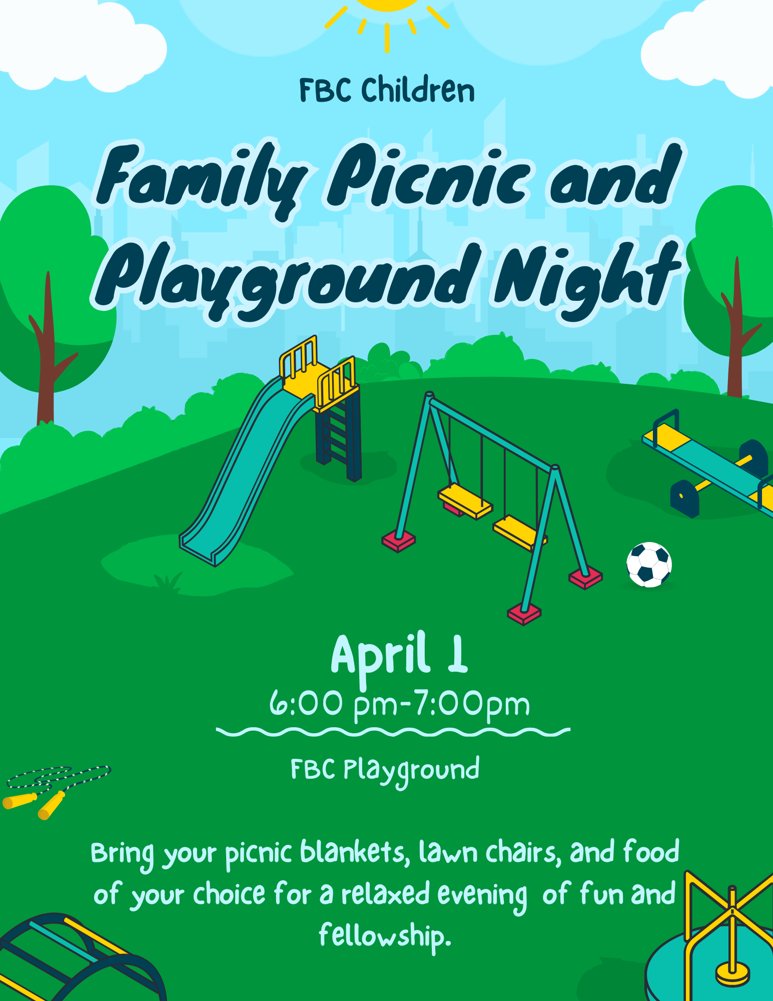 Pack up the family for an evening of outdoor fun and fellowship! Join FBC Children for a delightful family picnic followed by playground adventures under the open sky. This casual, family-friendly event is perfect for connecting with other church families while the kids burn off energy and make new friends.