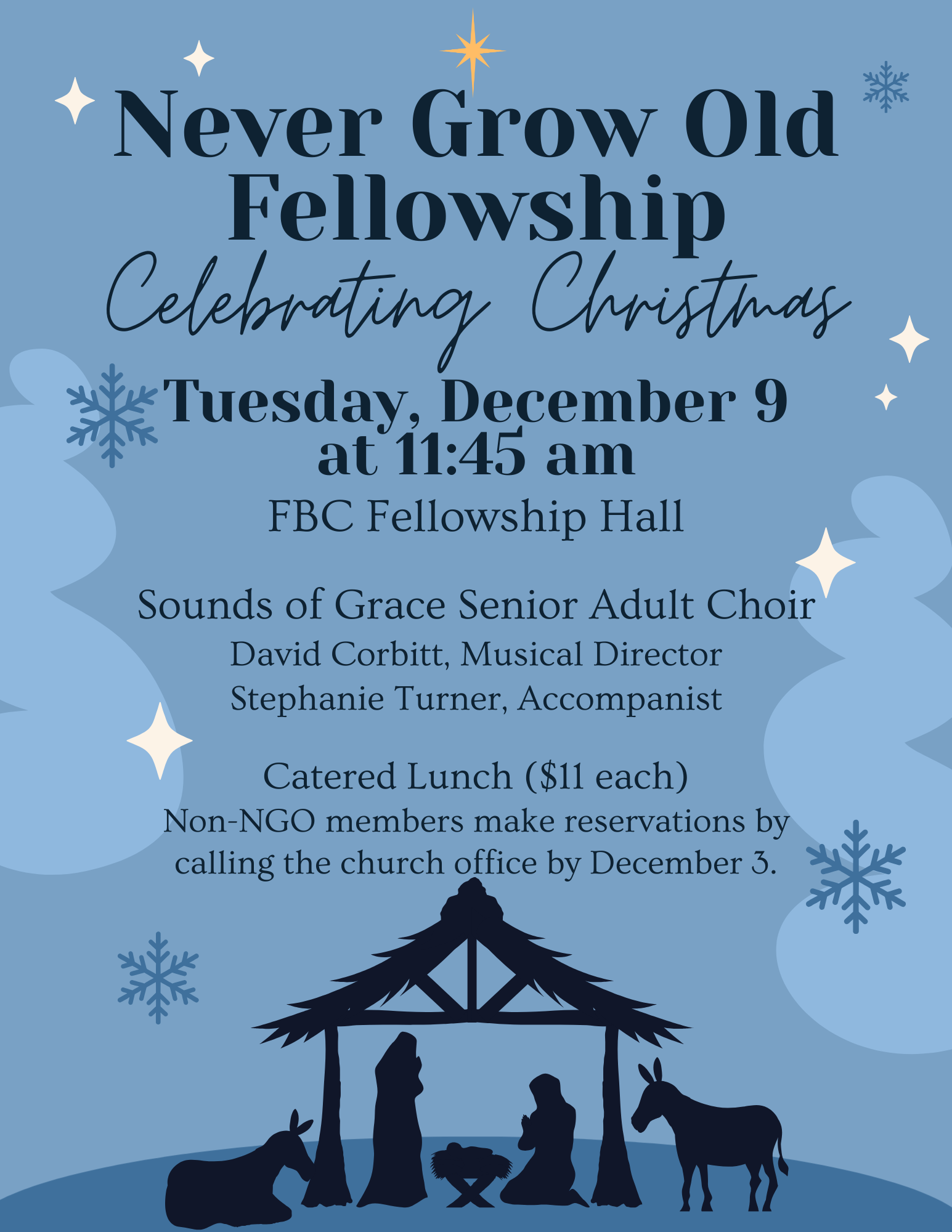 Join us for a special Christmas gathering with the Never Grow Old Fellowship! This festive event will feature a wonderful musical program by the Sounds of Grace Senior Adult Choir, directed by David Corbitt with Stephanie Turner as accompanist.