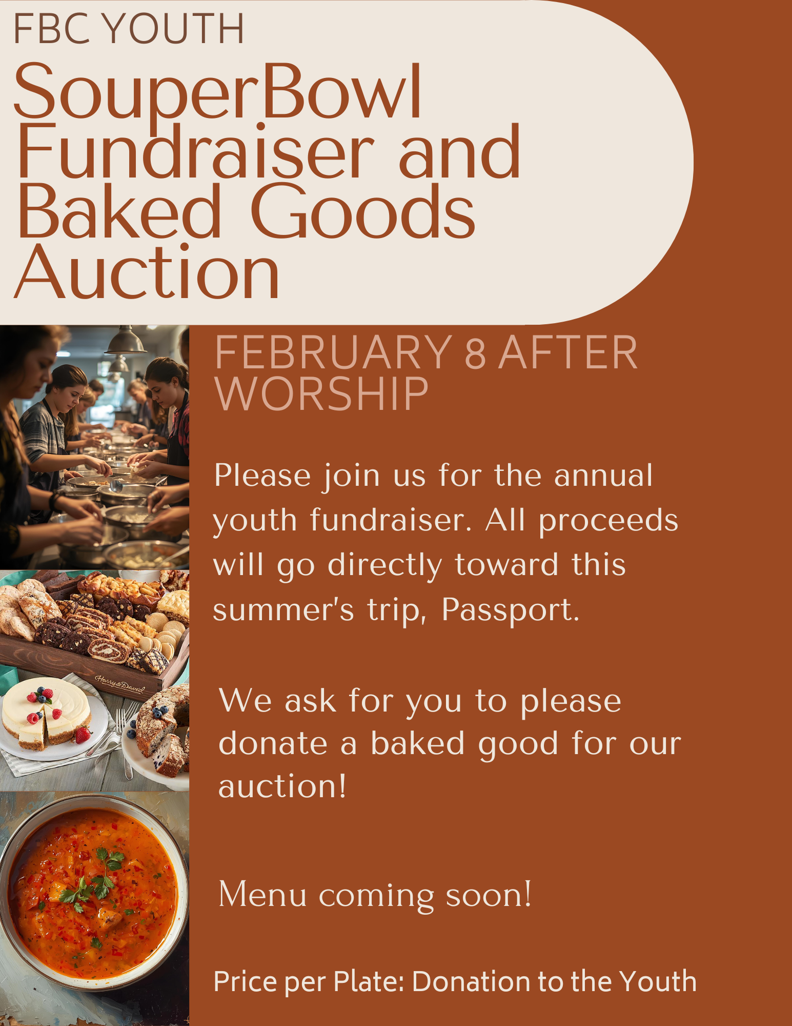 Join us on February 8, following worship, for the annual FBC Youth SouperBowl Fundraiser and Baked Goods Auction. This beloved event supports our youth, with all proceeds benefiting their summer Passport trip.