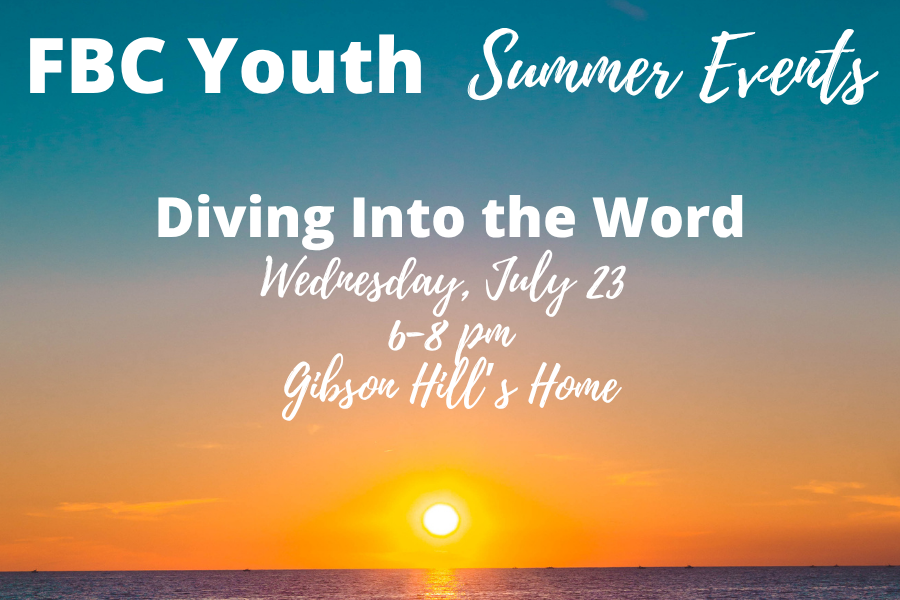 YOUTH: Diving Into the Word Wednesday, July 23, 2025 6:00 PM 8:00 PM Google Calendar ICS Diving Into The WordGibson Hill’s homeBring your bathing suit and a bible as we swim and have a devotion. Leave your wallet at home because this is a FREE event! Please let us know you're coming by signing up with Lauren.
